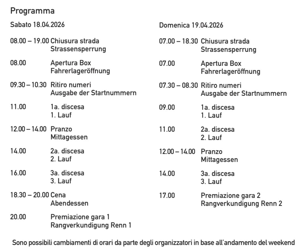 Sono possibili cambiamenti di orari da parte degli organizzatori in base all’andamento del weekend.